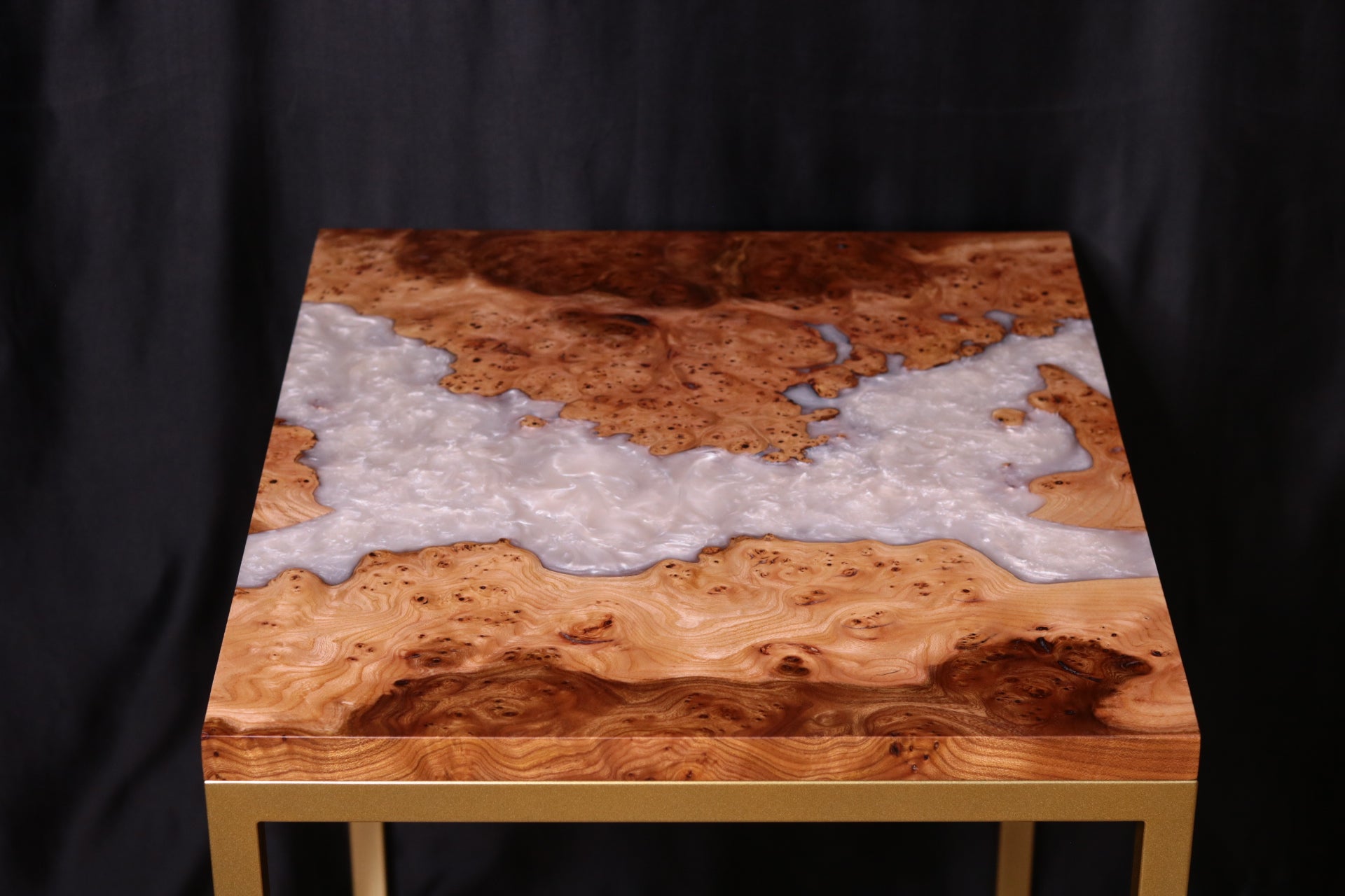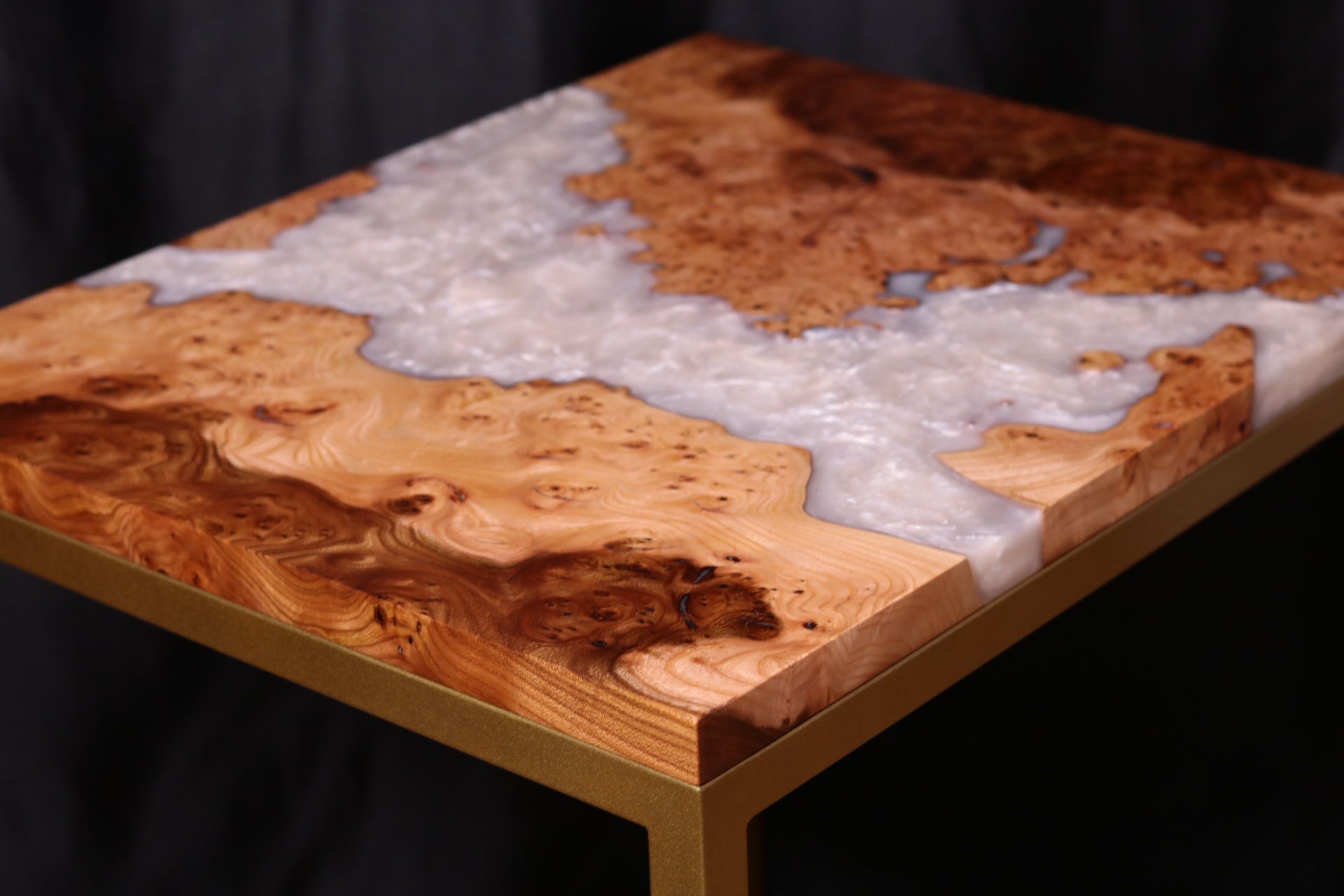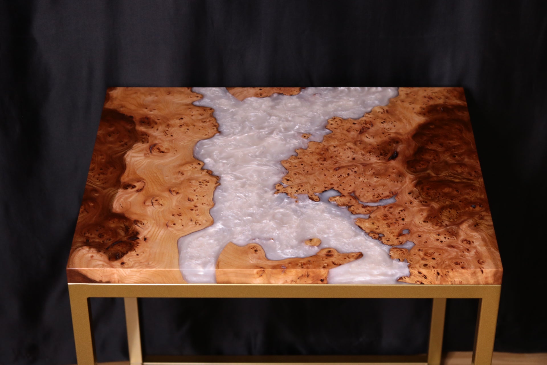 As to the design of this table, the white pearlescent resin river flowing through the natural curves of the live edge in this burl Elm is truly mesmerising and that accompanied by this gorgeous Burl Elm with deep figure and spalted inclusions really brings to life the creation and characteristics of this table, making it stand out and elevate any space it resides in.