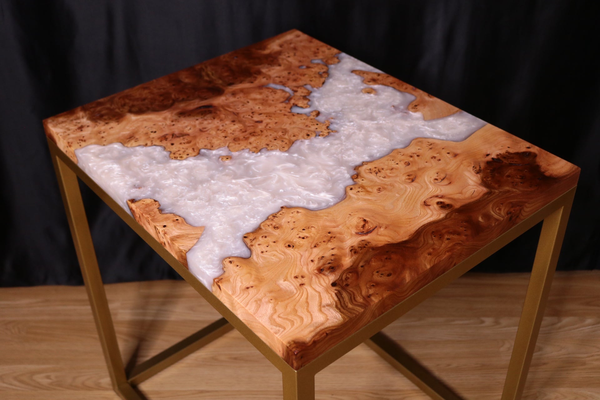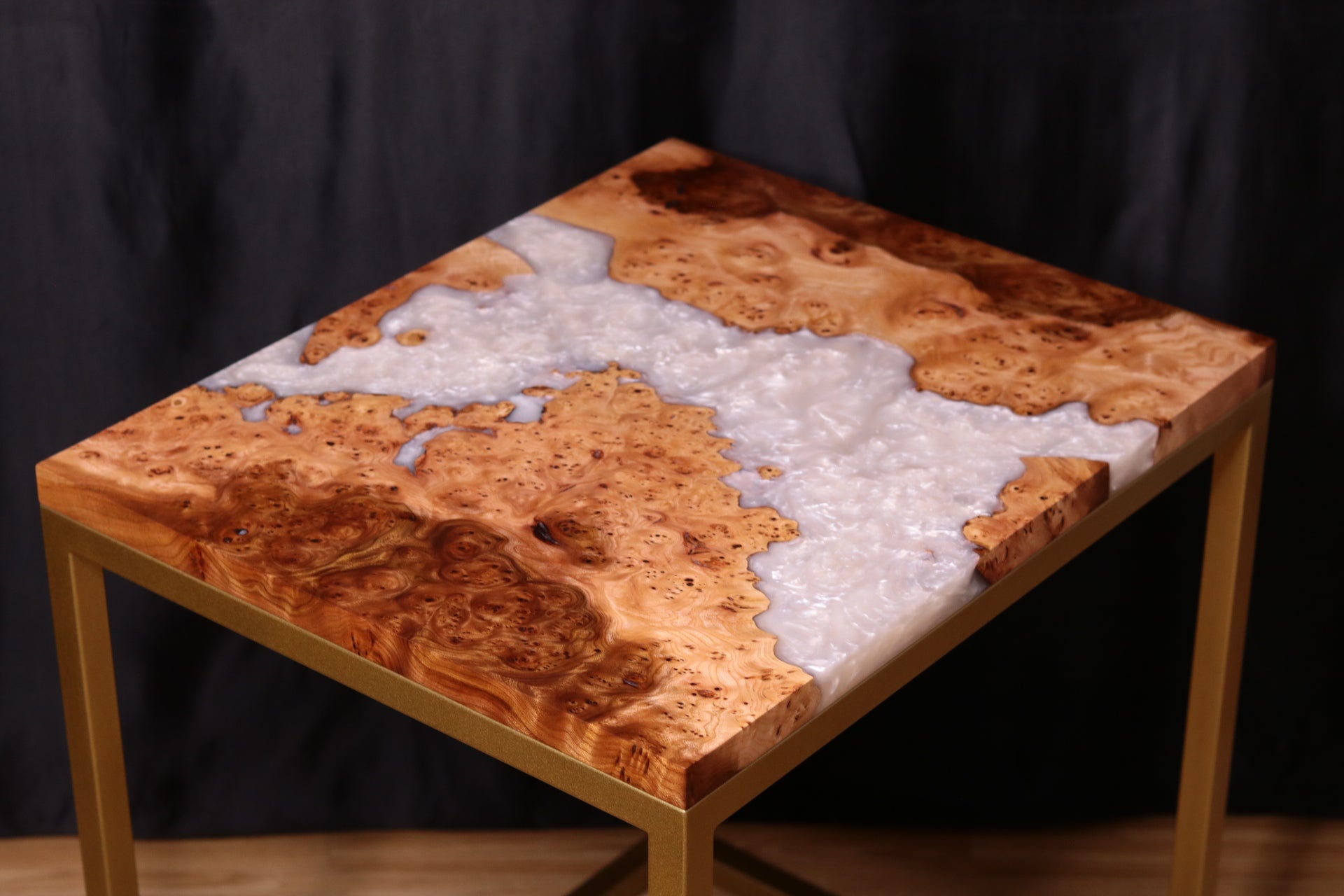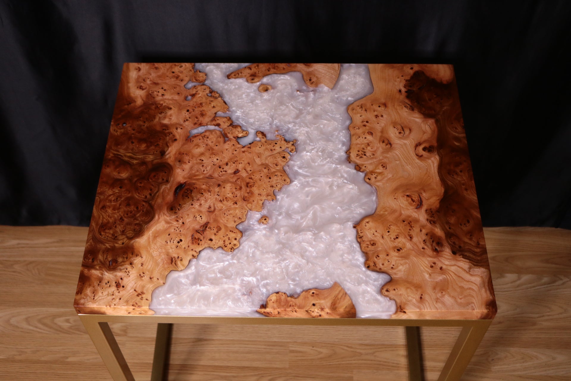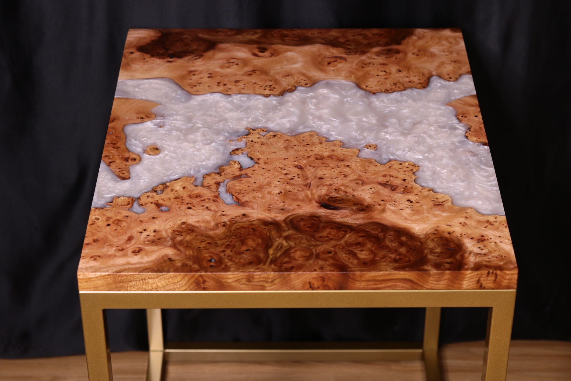 As to the design of this table, the white pearlescent resin river flowing through the natural curves of the live edge in this burl Elm is truly mesmerising and that accompanied by this gorgeous Burl Elm with deep figure and spalted inclusions really brings to life the creation and characteristics of this table, making it stand out and elevate any space it resides in.